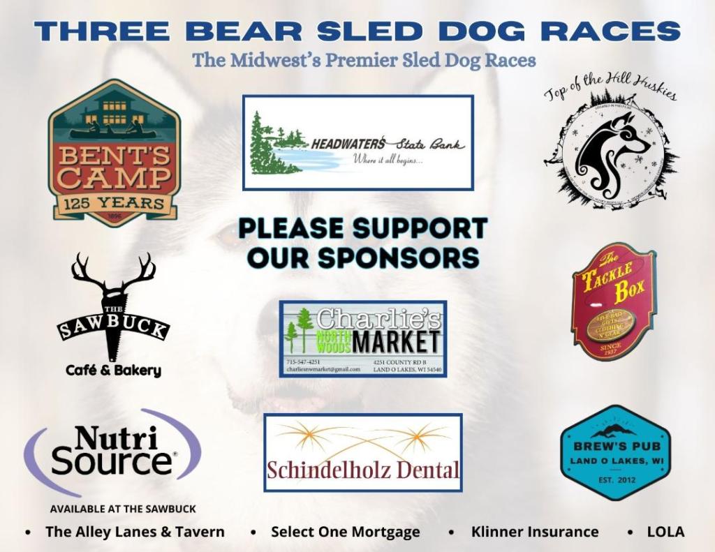 The Three Bear Sled Dog Race has brought back the North Woods tradition of sled dog racing to Land O’ Lakes, Wisconsin. It is known as one of the premier spectator races in the northern Midwest and is a favorite destination for mushers alike. Racing in Northern Wisconsin, the Three Bear offers beautiful trails in Eight Dog, Six Dog, Four Dog, Two Dog, Juniors and Skijoring classes. Area civic groups join in the festivities. This year the Siberian Husky club of America has decided to sponsor the register breed classes (RB) with additional purse and metals.